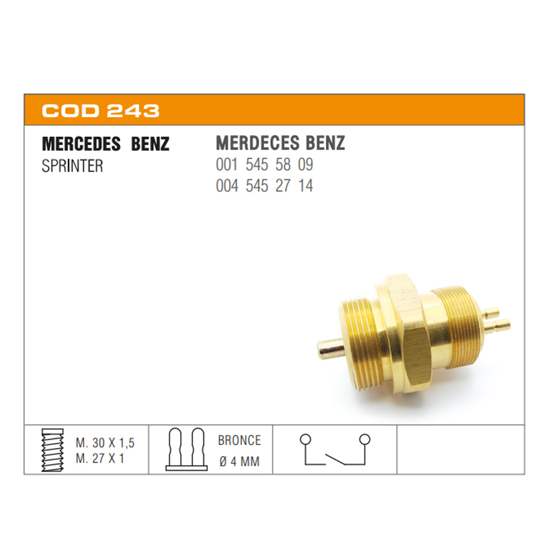 Interruptor de stop Interruptor de retromarcha Interruptor de presión de aceite Interruptor de electroventilador Interruptor de puerta Interruptor de corriente Portalamparas Sensores de temperatura de agua Sensores de presión de aceite eléctrico Termoválvulas de comando carburador Sensores de inyección Conector Sensor de Temperatura Termostatos